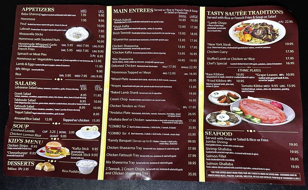 Shish kabob, shish kafta, tawook, shawarma, fried kibbe, falafel and grape leaves.