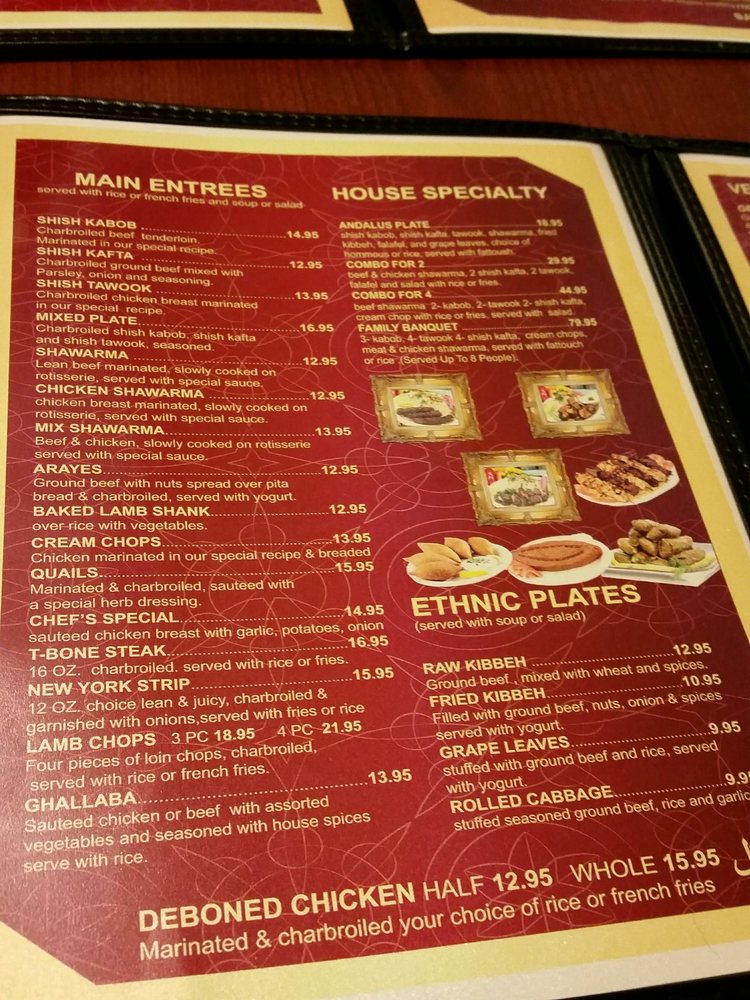 Whether you're dining in the quiet ambiance or enjoying the outdoor seating, Andalus provides a casual yet welcoming experience, complemented by generous happy hour specials and convenient services like delivery and takeout. With facilities for groups, catering, and even a military discount, Andalus Mediterranean Grill promises a memorable dining experience for all.